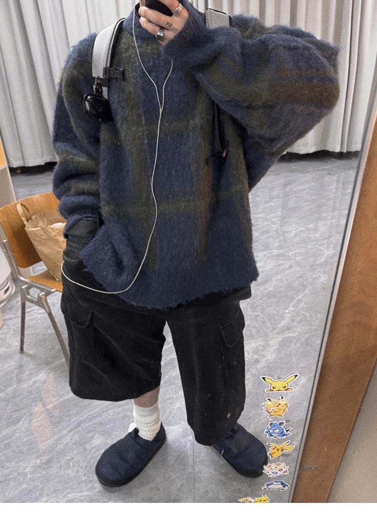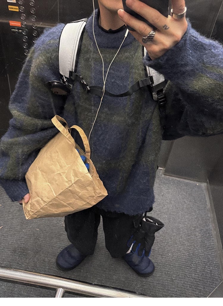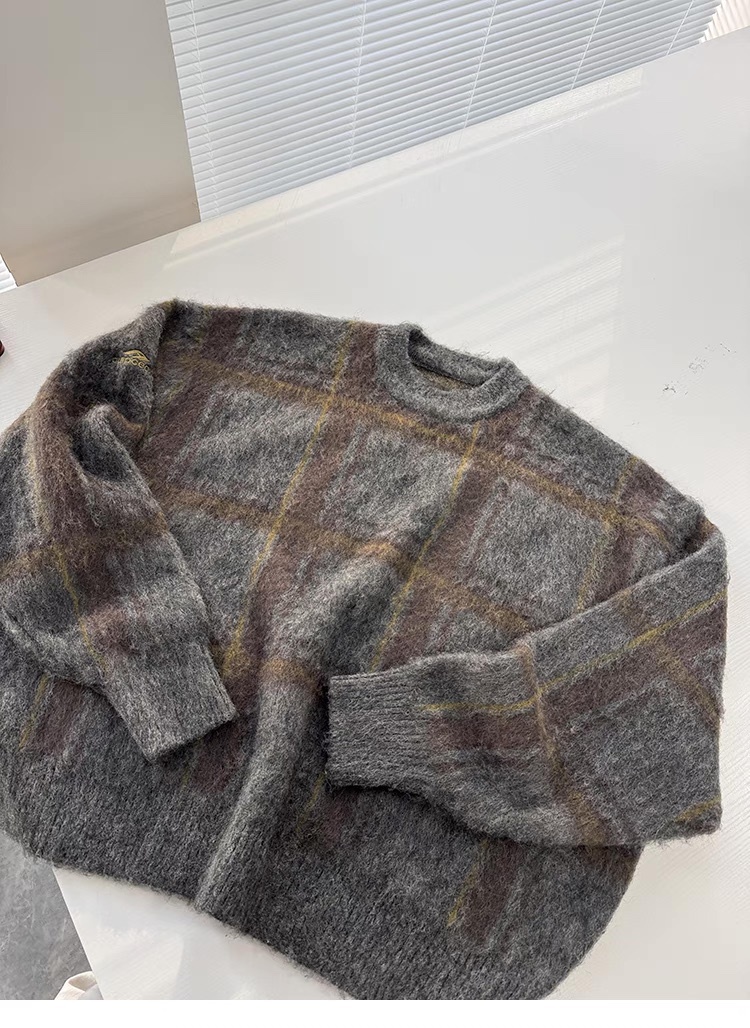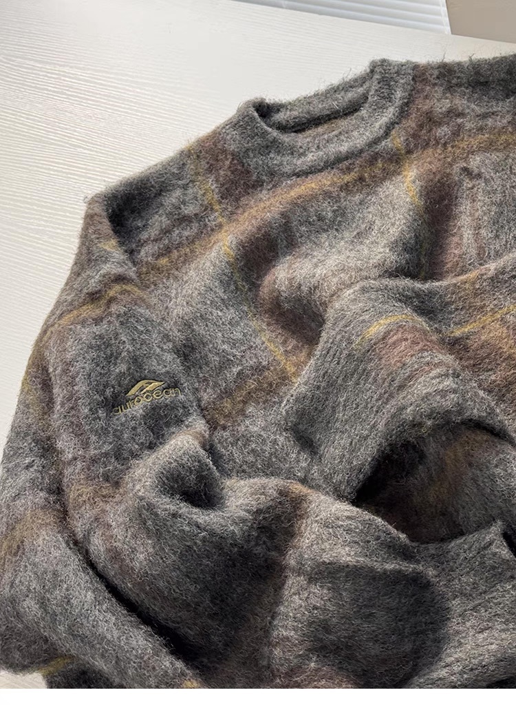 Aurocean 復古 撞色 格紋 馬海毛 針織毛衣