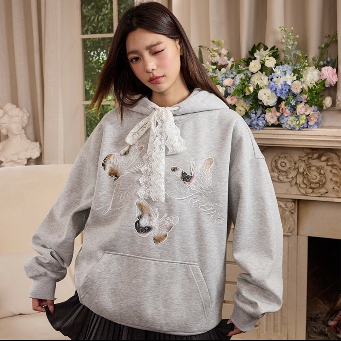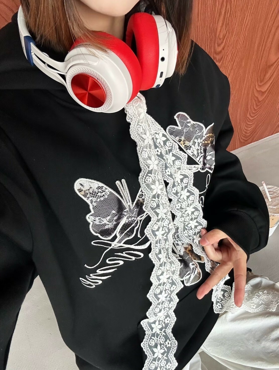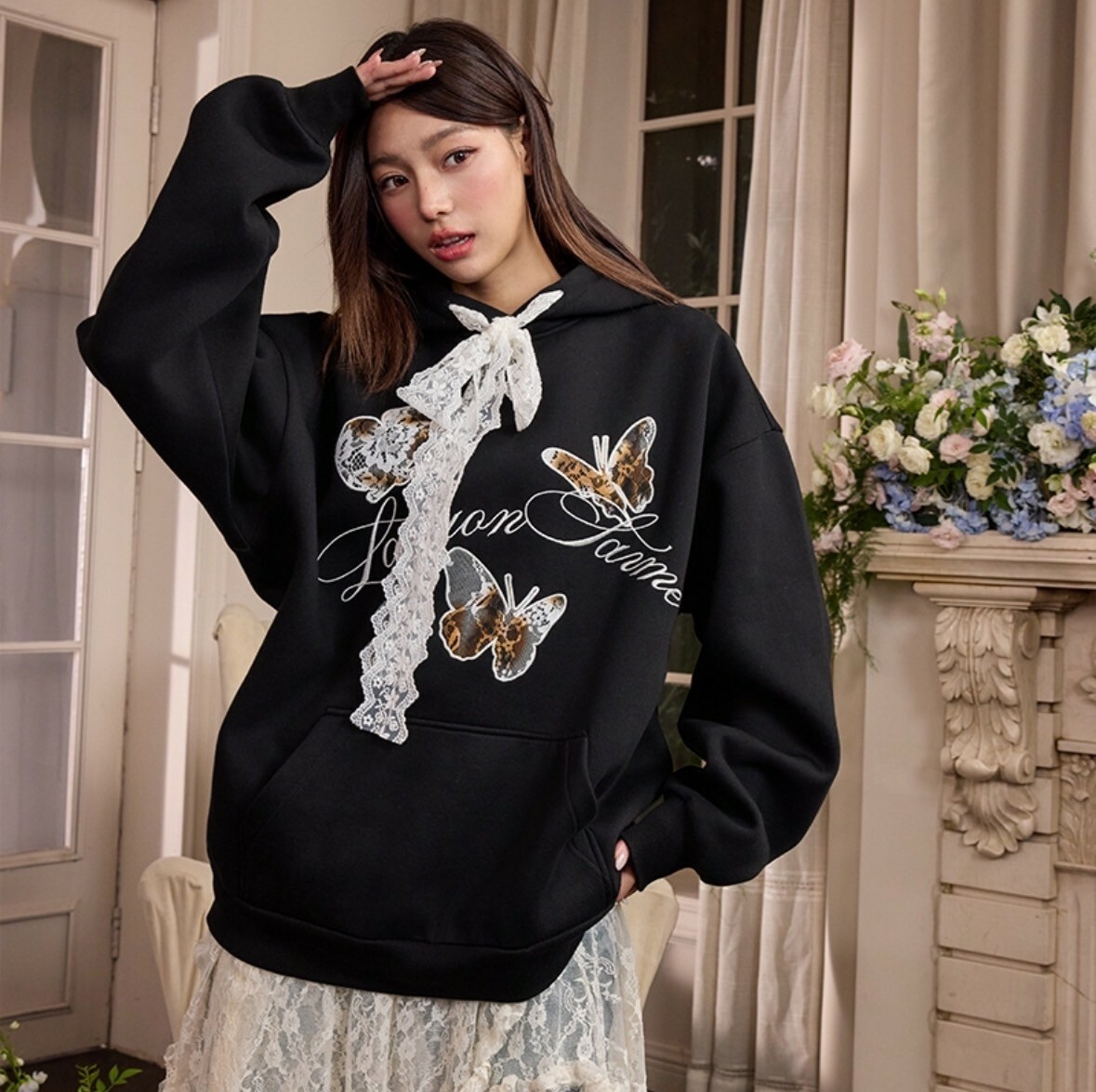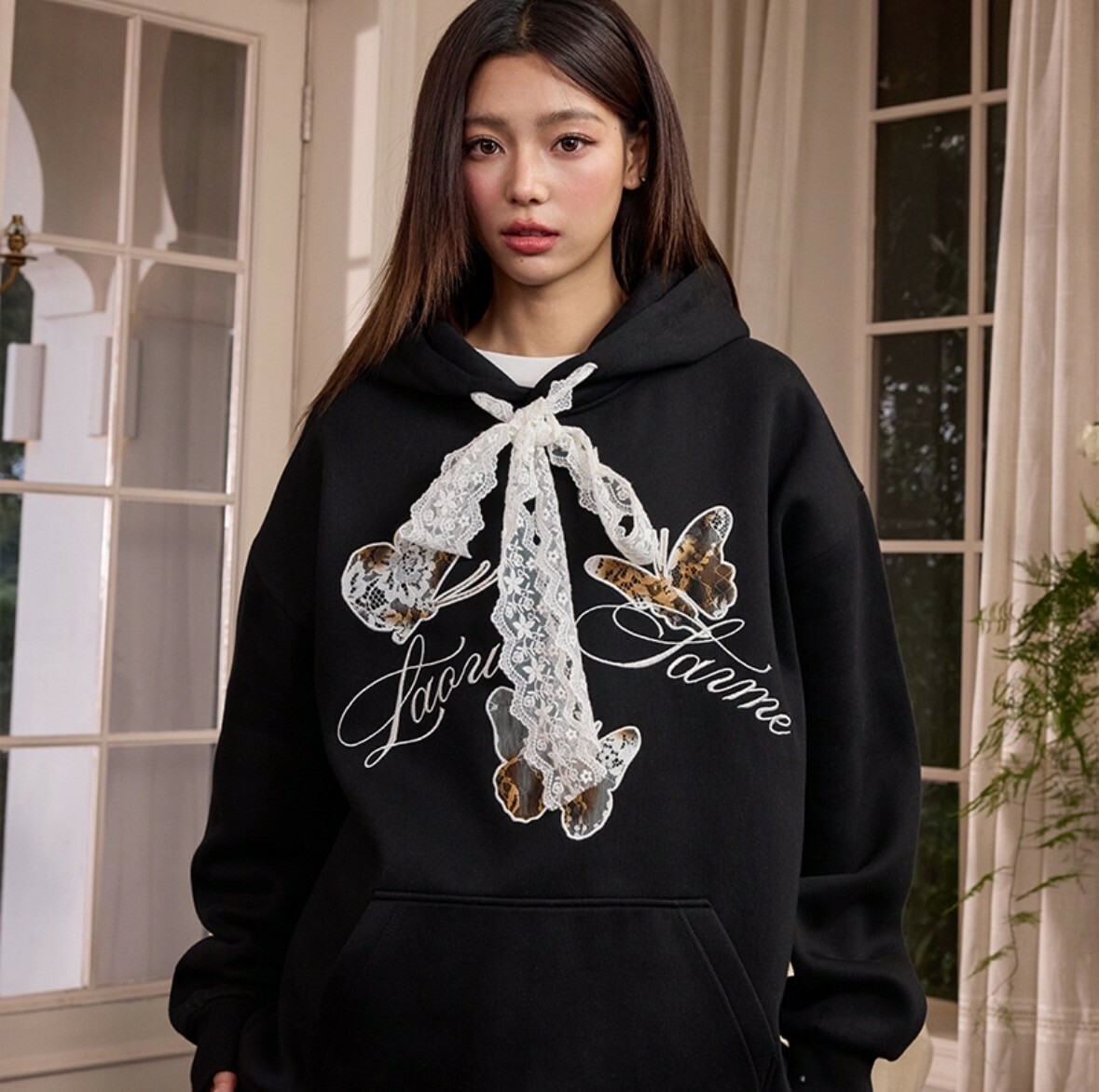 harsh and cruel 2025SS 美式 手寫 花體 火燒蕾絲 貼布 刺繡蝴蝶 帽T