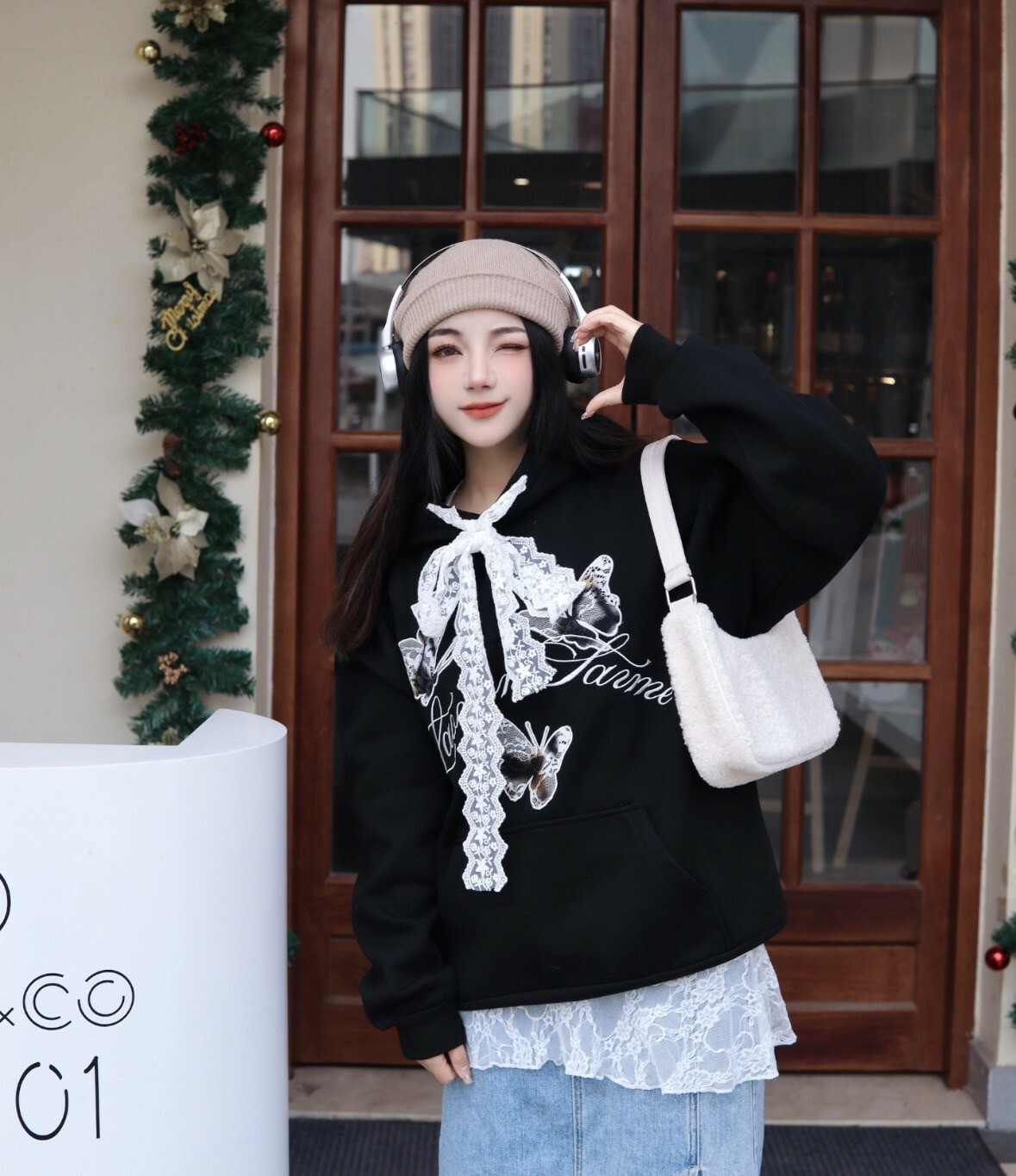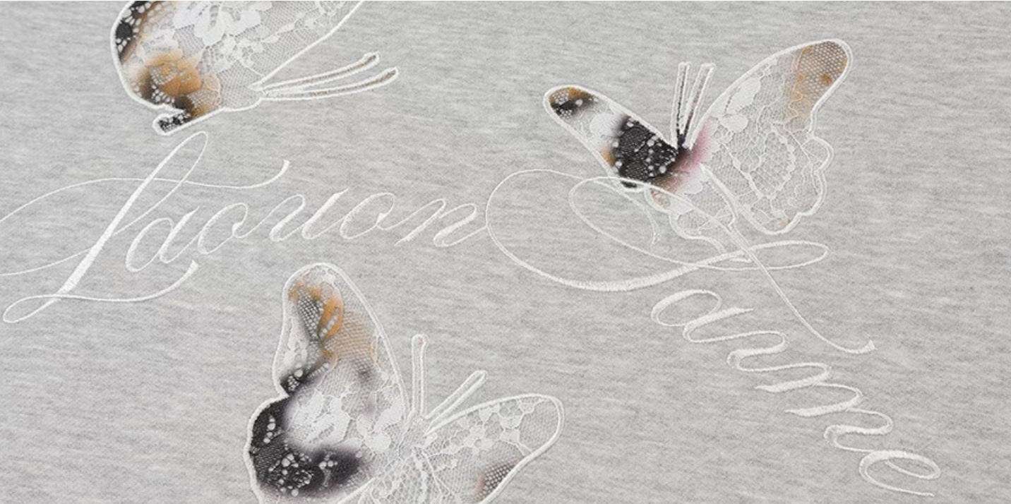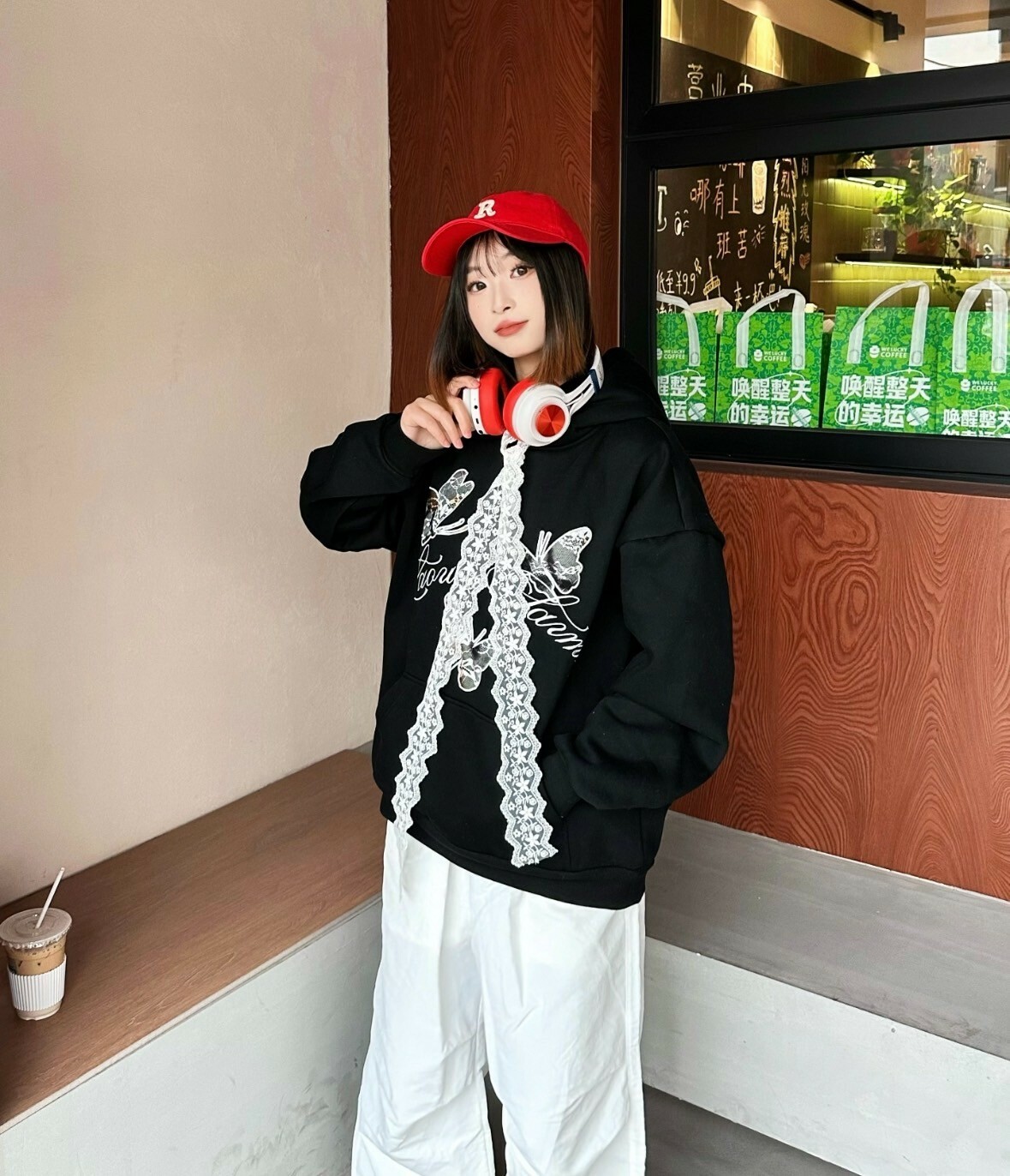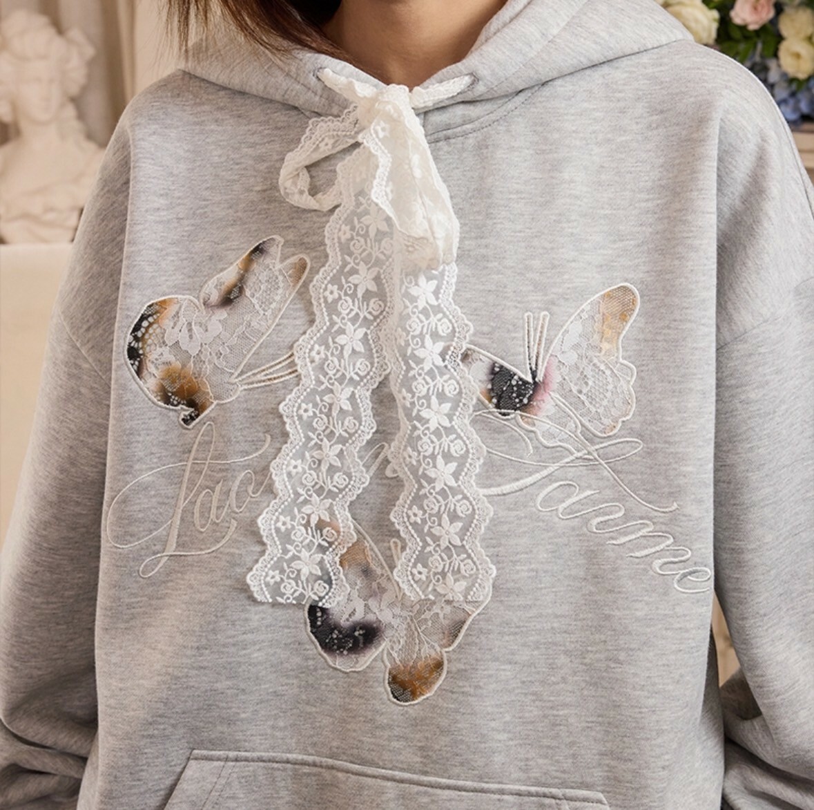 harsh and cruel 2025SS 美式 手寫 花體 火燒蕾絲 貼布 刺繡蝴蝶 帽T