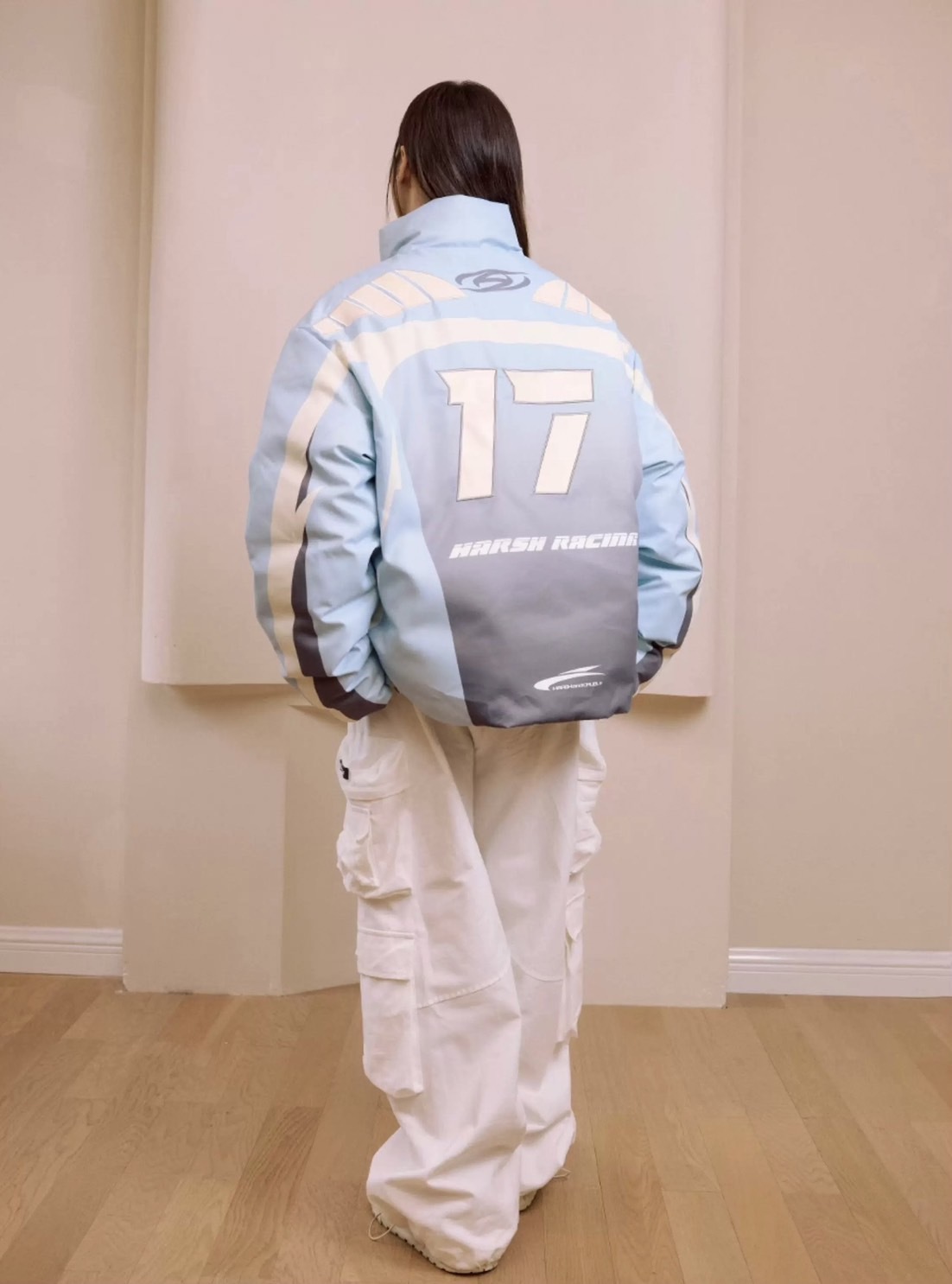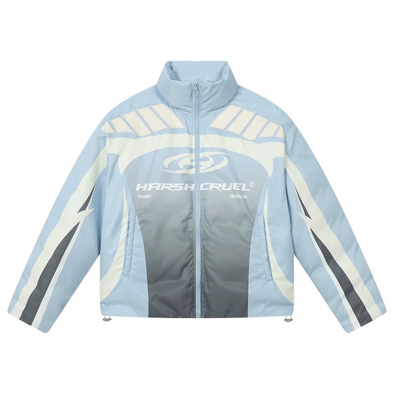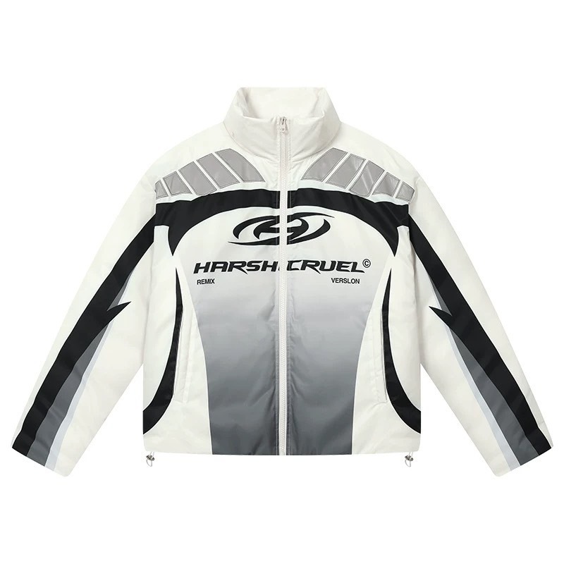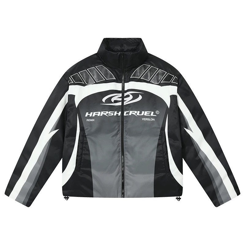 harsh and cruel 撞色分割賽車漸層滿印刺繡貼布輪廓石墨烯保暖棉服