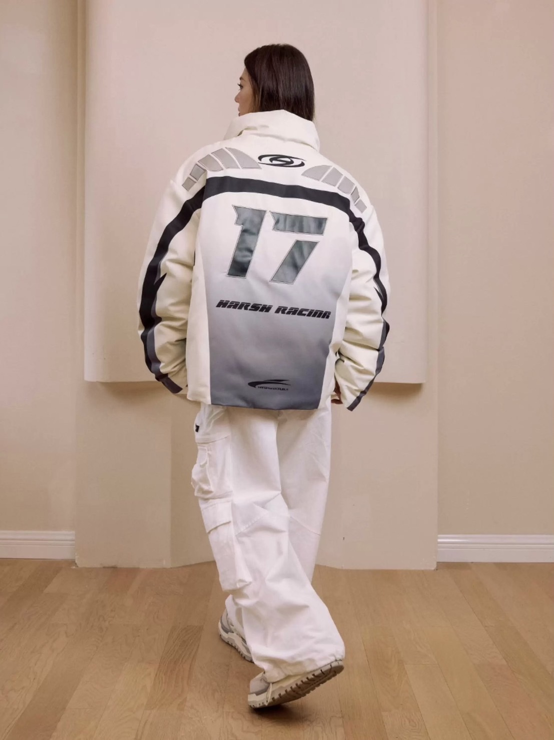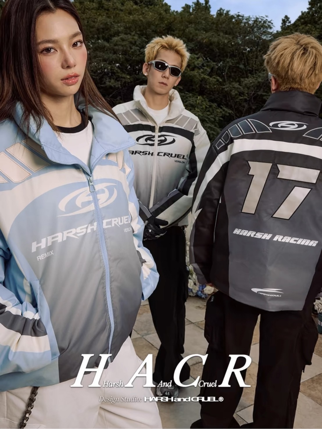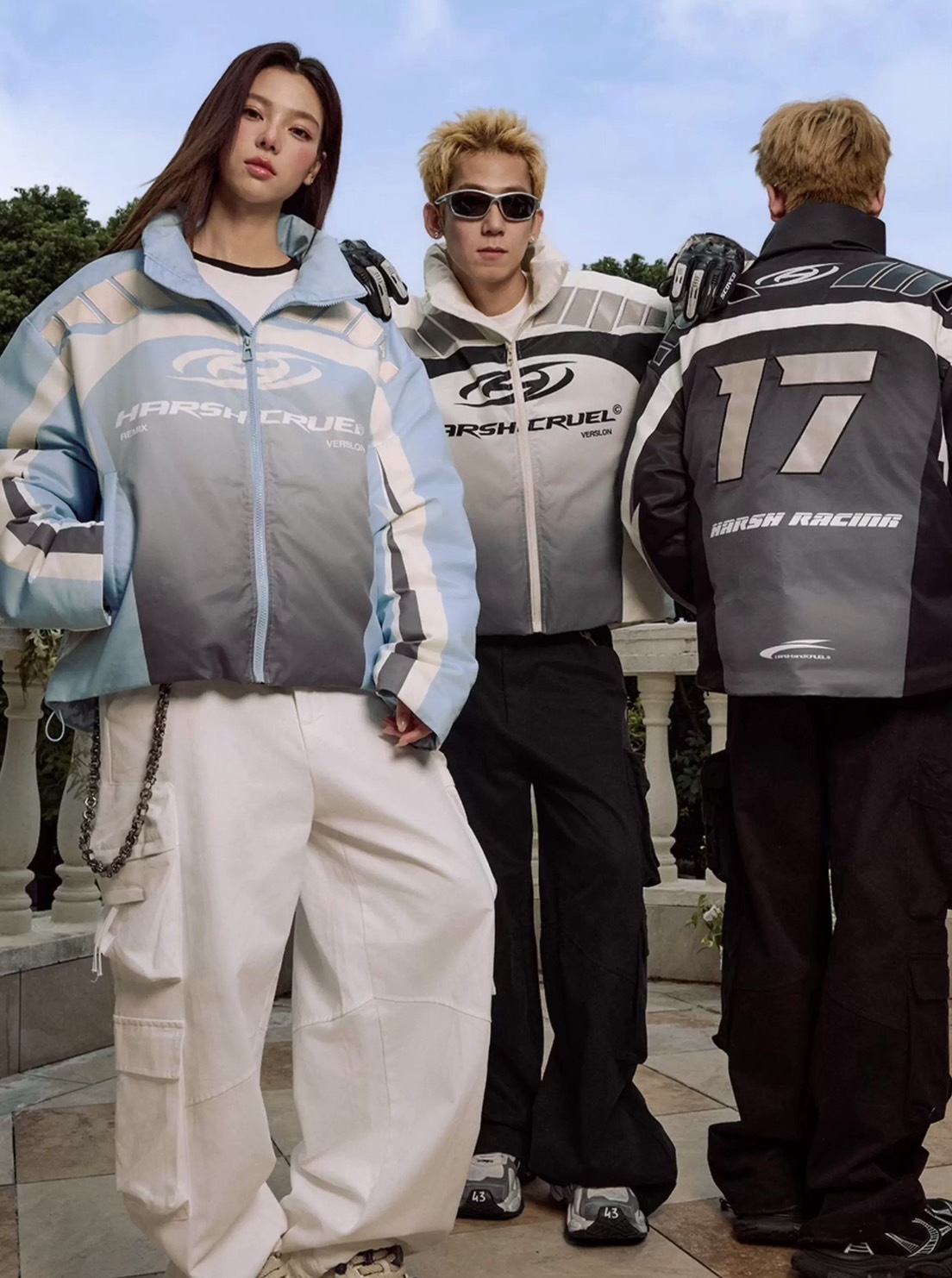 harsh and cruel 撞色分割賽車漸層滿印刺繡貼布輪廓石墨烯保暖棉服