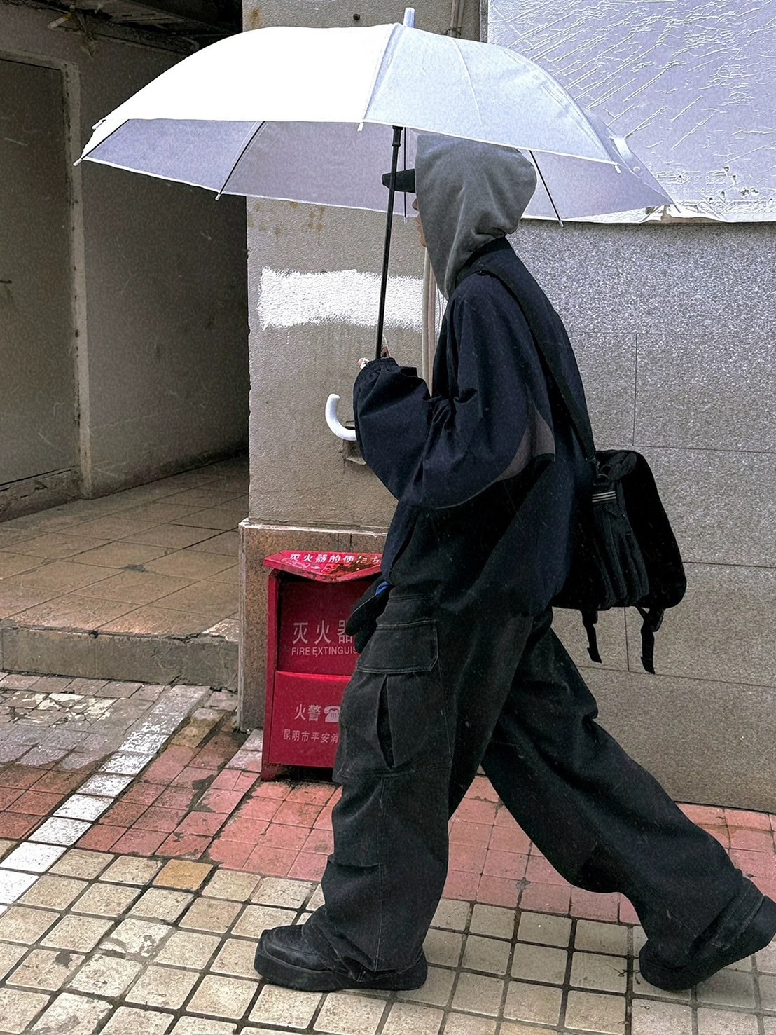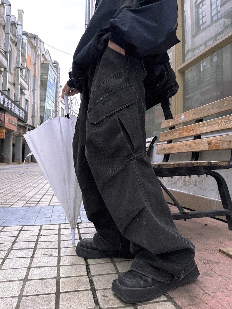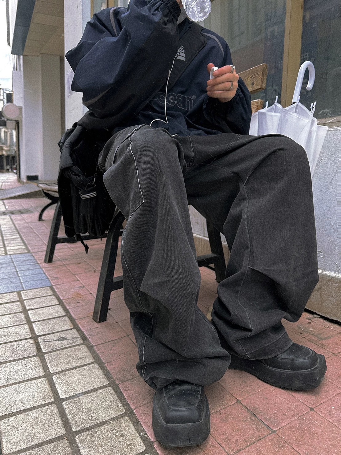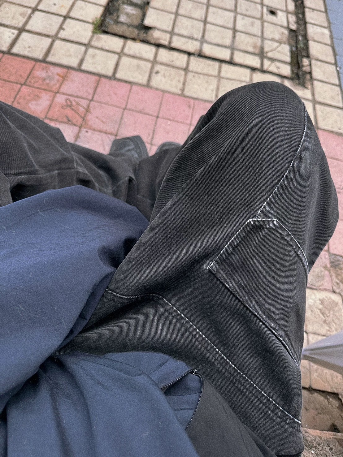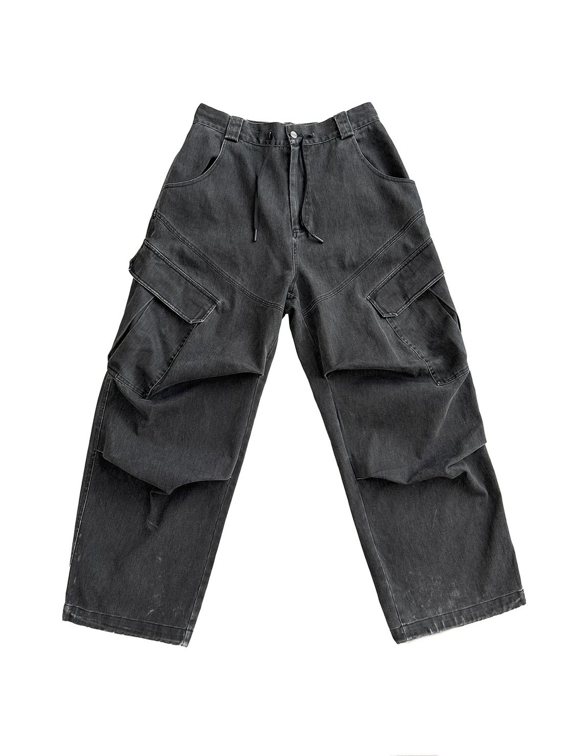 Aurocean 370克重磅純棉水洗做舊黑色工裝褲