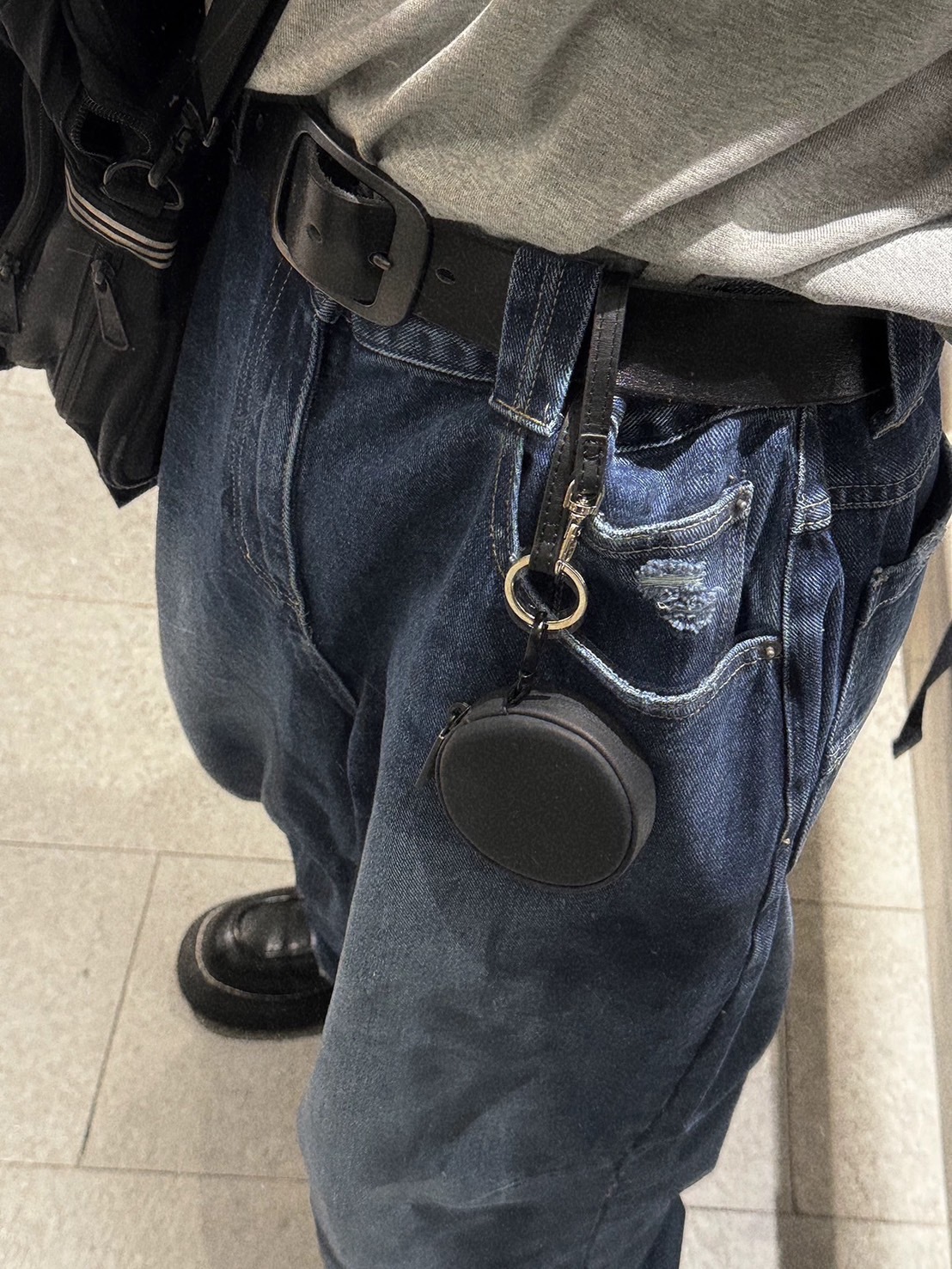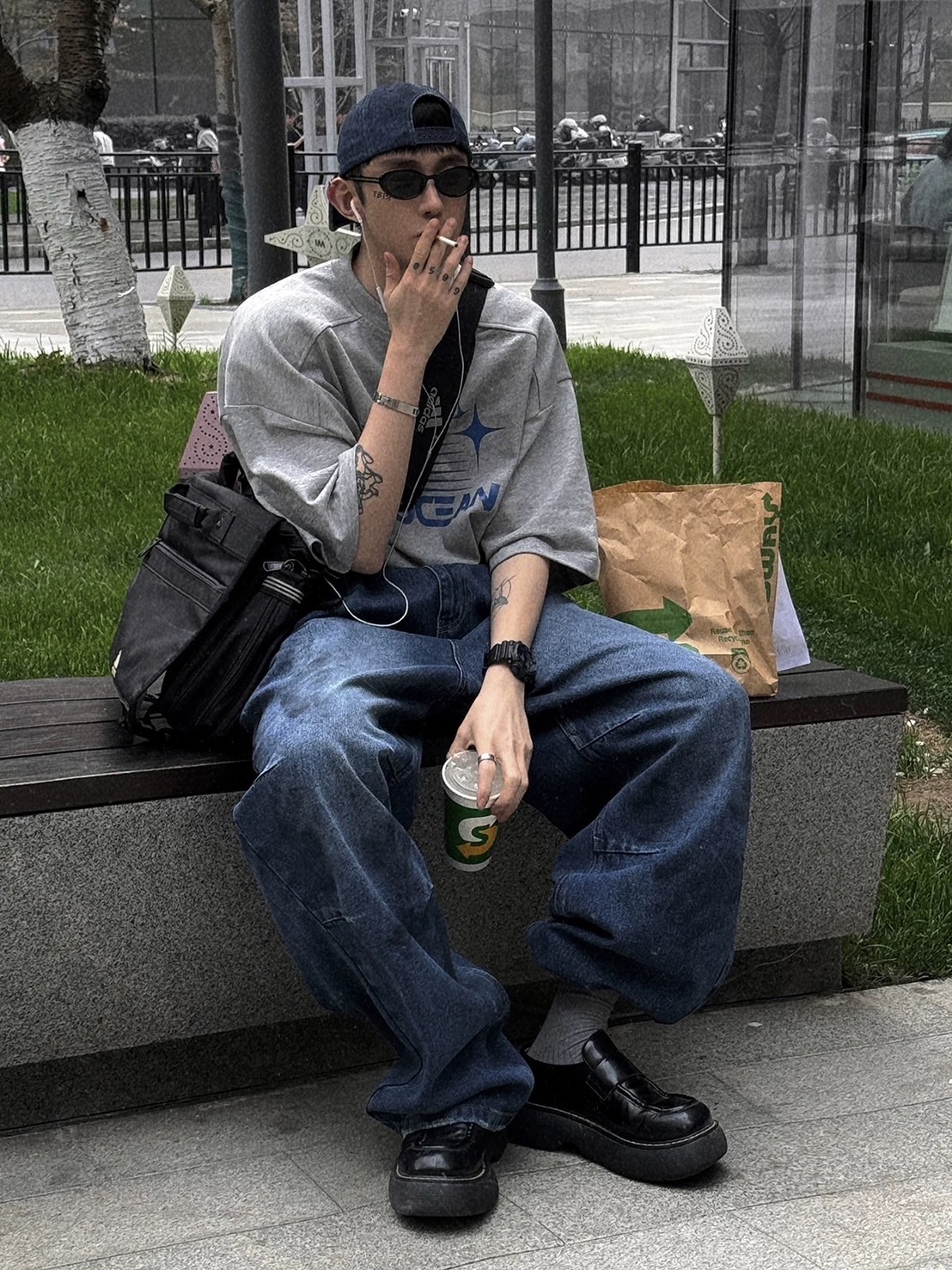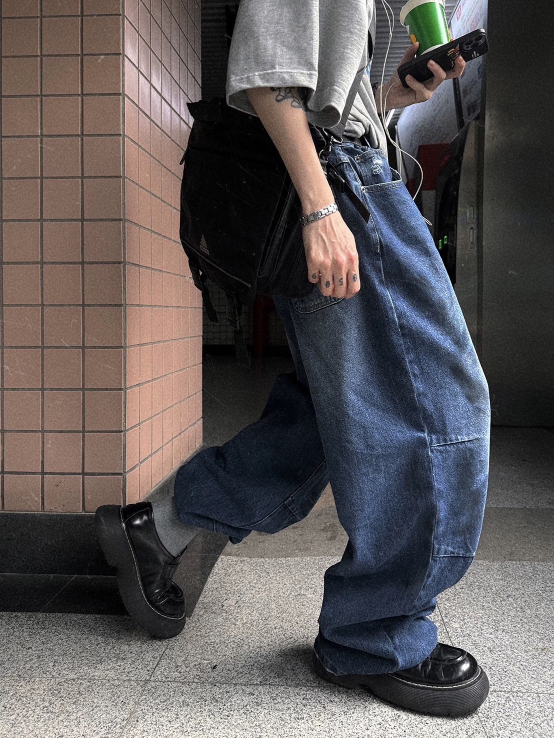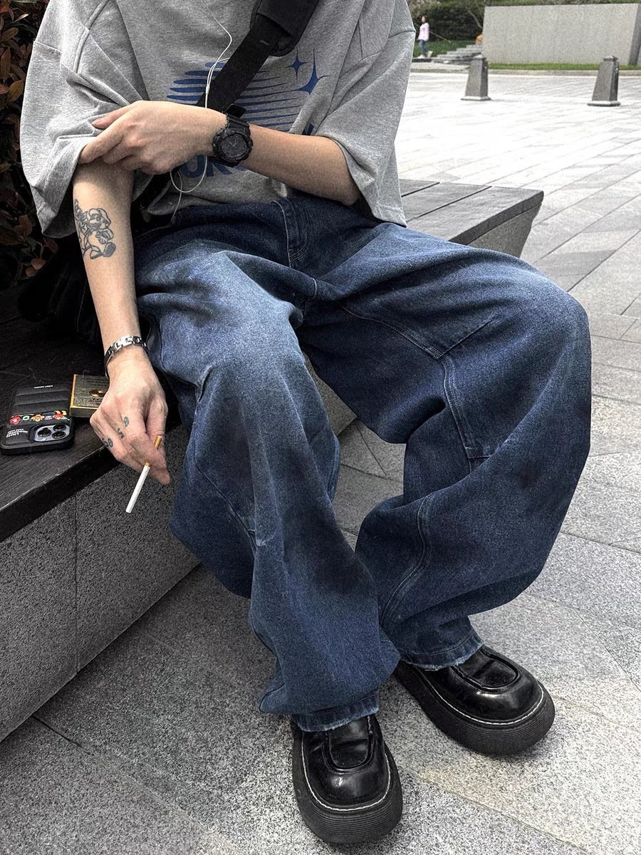 Aurocean 水洗深藍做舊磨損寬鬆牛仔褲