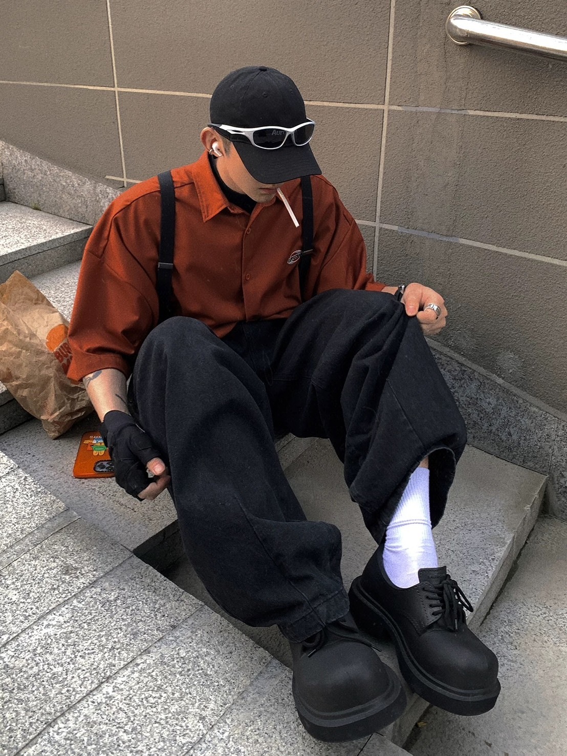 Aurocean 黑色水洗復古做舊寬鬆牛仔褲