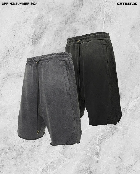 CATSSTAC 重磅水洗做舊抽繩不收邊短褲